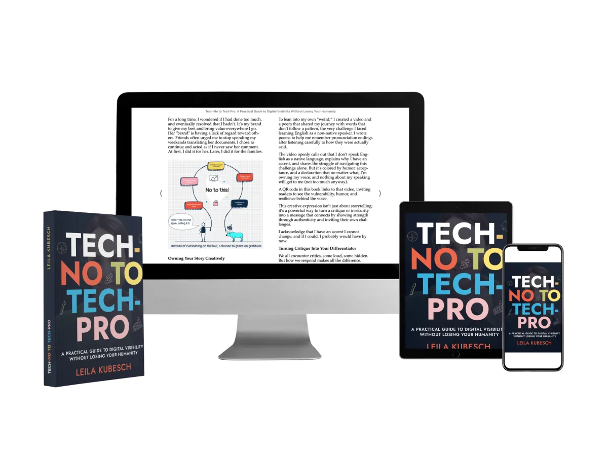 Writing Tech-No to Tech-Pro grew out of that journey. I wanted to offer a path that feels natural, kind, and sustainable. In my coaching, I help people move from hesitant to confident by using small, repeatable actions that create real momentum.